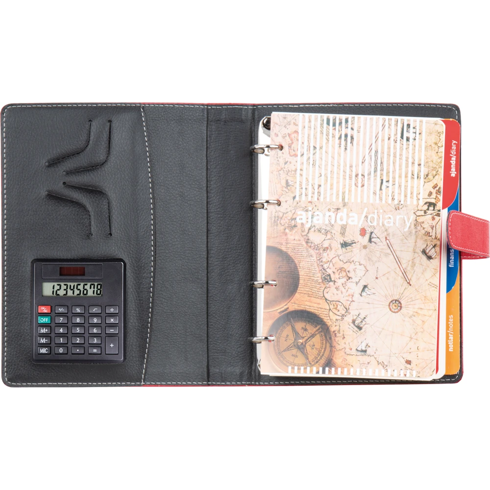 * Deri: Termo * Metal Toka: Var * Hesap Makinası: Var * Ebat: 18 x 23 cm * Baskı: Gofre, Lazer * Koli Adeti: 30 * Ajanda Ebat: 15 x 21 cm * Sayfa Sayısı: 352, Çizgili * Kağıt: 70 gram krem